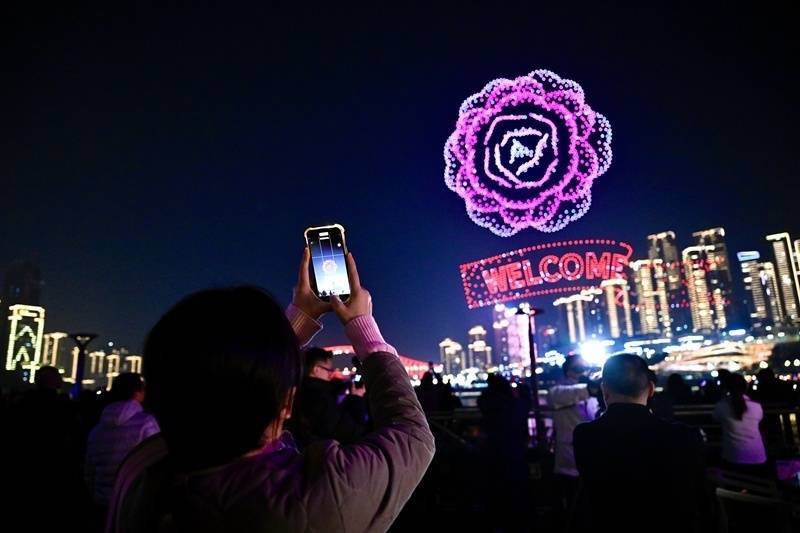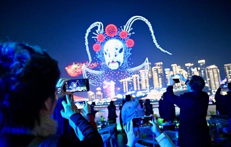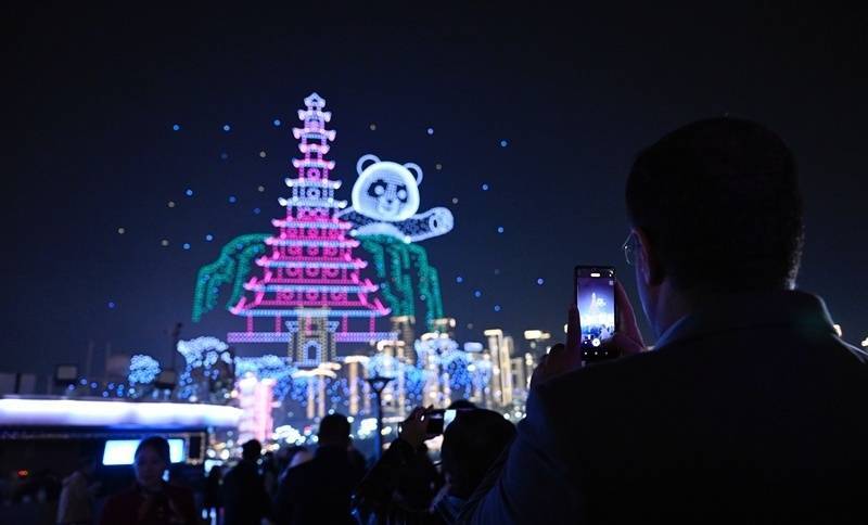 11月27日晚,“新韵重庆”无人机灯光秀亚洲文化遗产主题专场表演举行,嘉宾纷纷拿起手机记录下精彩瞬间。记者 齐岚森 摄